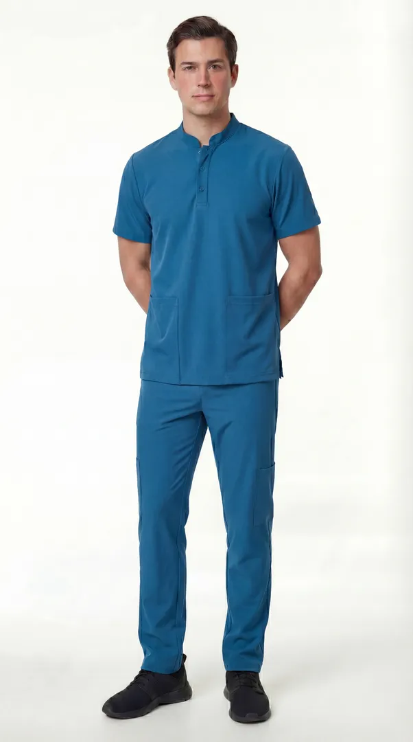 A sophisticated take on professional wear, featuring a refined Mandarin collar and a hidden button placket. This set offers a polished, executive look without sacrificing the comfort of high-performance medical gear.